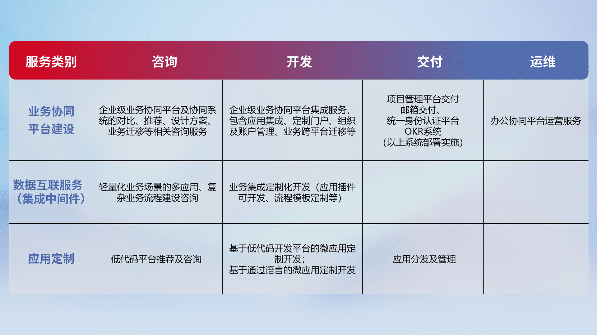 针对钉钉、、、企微、、、、IDaas等平台级产品提供产品的规划、、方案、、交付、、定制化开发等服务,,实现如统一协同办公、、、、智能客户服务、、混合会议管理、、智能数据查询、、等业务场景,,,实现数字化转型。。。